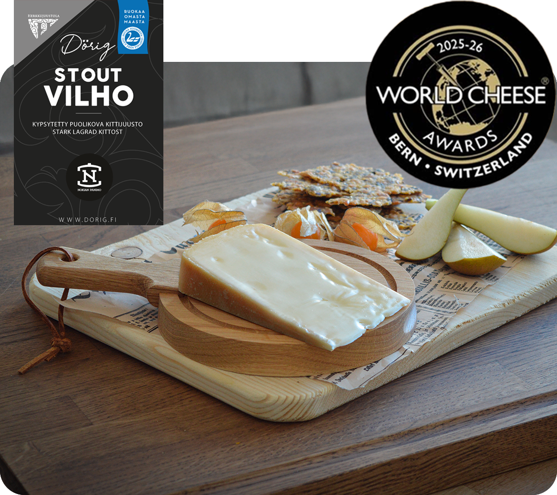 StoutVilho ist ein aus Kuhmilch hergestellter Rotschmierkäse. Bei der Pflege des Käses wird Stout-Bier der Nokian Panimo verwendet. Sein tiefer, kräftiger und zugleich weicher Geschmack vereint Röstnoten, feine Bieraromen und eine ruhige, runde Ausgewogenheit.